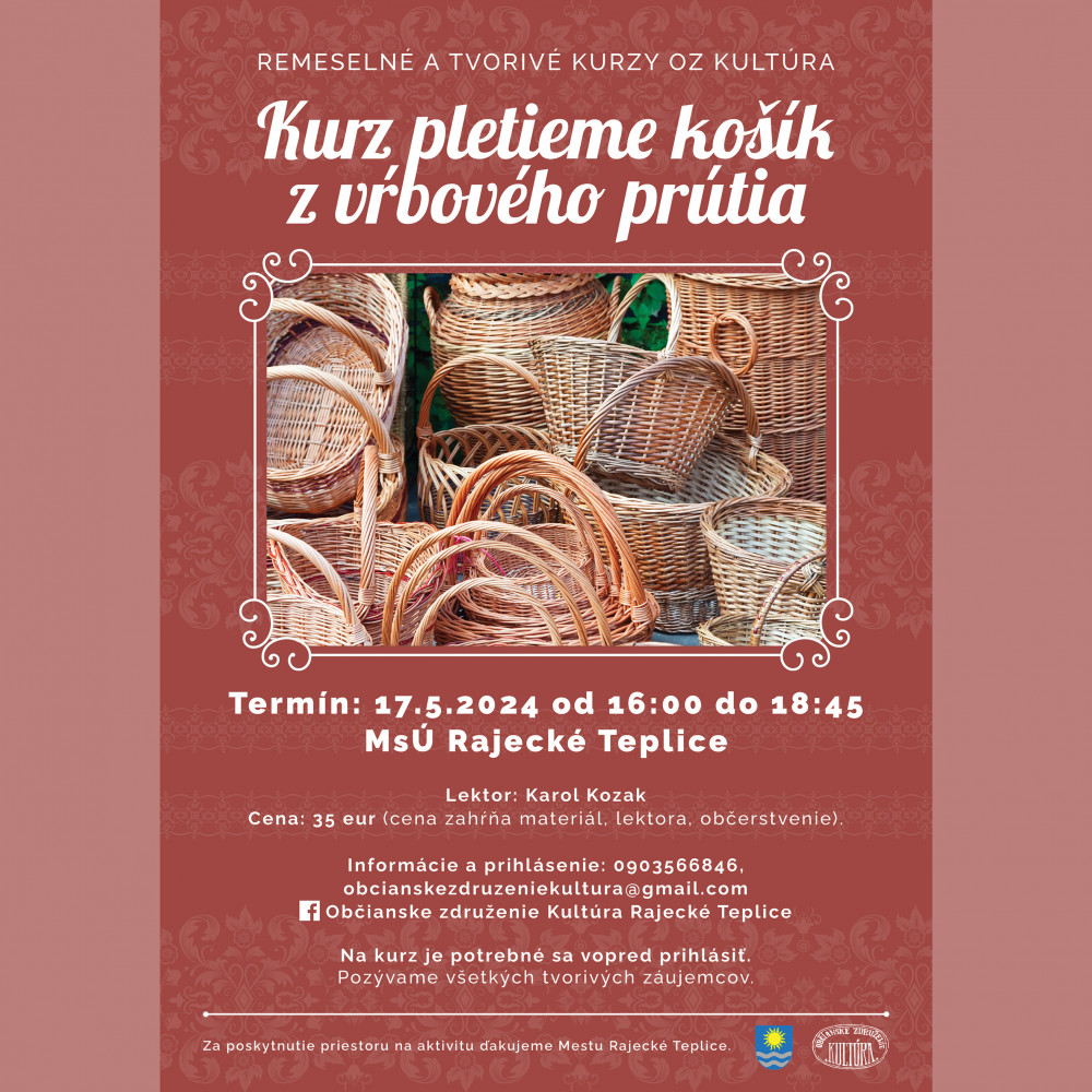 OZ Kultúra Rajecké Teplice Vás srdečne pozýva na kurz, kde si môžete vyskúšať upliesť vlastný košík z vŕbového prútia.